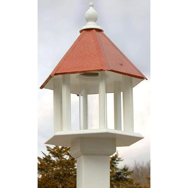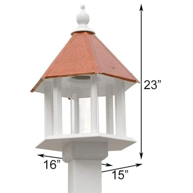 This impressive feeder has six white columns surrounding the seed tube, and upholding the six-panelled galvanized roof. The feeder body is made from solid PVC trimboard, which will not mold, mildew, or delaminate, and will stay stable for 25 years. Galvanized metal with a hammered copper finish covers the roof, perfectly contrasting with the white trimboard finial. The finial can easily be removed for quick cleaning and refilling of the seed tube. Mount this feeder on a 4″ x 4″ post (not included) to complete your bird garden. Celebrate bird feeding with the Azalea Bird Feeder with Hammered Copper Roof. Handmade in the USA.