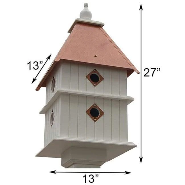 Invite a group of birds to establish a colony in your yard with the Wing and A Prayer Plantation Bird House. This dramatic home houses eight separate birds at once, for constant avian activity. Ledges around the base of each level help visually divide the home, as well as offer a perching or takeoff spot for fledglings. Vertical panels lend a classic design look to the house, and the white color adds a crisp feel. Each 1.5″ diameter entrance hole is surrounded with a metal predator guard, matching the copper color and finish of the roof for added dimension. A white finial tops the piece, adding height to the unit. Remove the roof and each floor in the house for seasonal cleanings and nest checks, to keep it usable for the next year. The hammered finish on the copper colored metal roof adds an elegant look to the unit. Constructed of solid PVC trimboard, this house is designed not to mildew, mold, or delaminate with exposure to the elements, and will remain stable for up to 25 years. Use the preinstalled mounting collar to connect this home to a 4″ x 4″ post (not included), bringing height to the abode. House several birds in your garden with this Plantation Bird House with Hammered Copper Roof. Made in the USA.