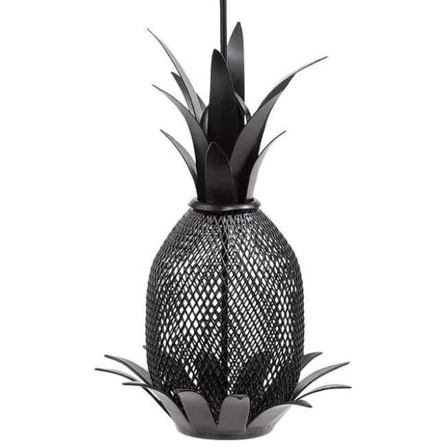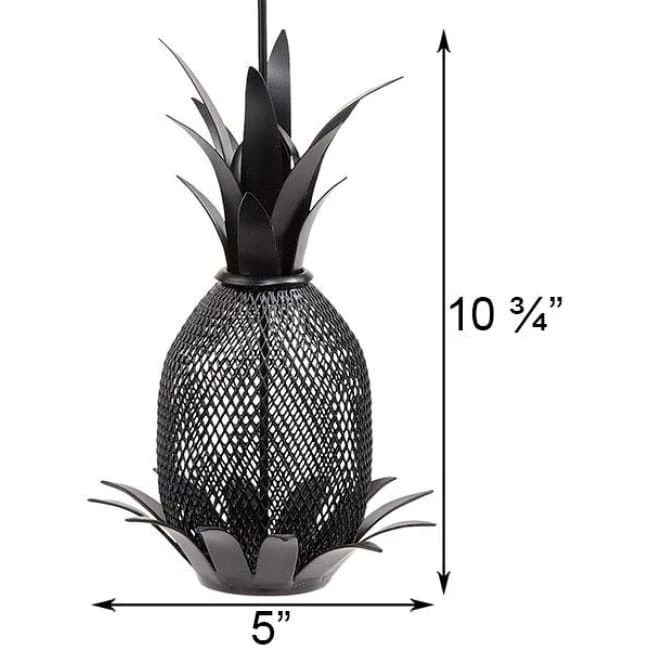 Turn a bit of your backyard into a welcome feeding spot for songbirds with the Achla Pineapple Bird Feeder. The familiar shape of this mesh unit adds a tropical hint to your garden, while its wrought iron construction creates a durable piece. Metal leaf shapes at the top and base of the unit enhance the pineapple figure, and round rods form a framework. A diamond shaped, metal mesh surrounds these rods, creating a reservoir which accommodates up to 1 quart of peanut chunks or sunflower seed. This design allows clinging birds to reach the seed easily, while you can monitor feed levels in moments. An included, metal rod threads through the center of the feeder for strength and stability, and a ring at its top enables the item to be hung. The pineapple’s crown of leaves slides up this rod for easy refilling, and the shaft may be removed for thorough cleaning. The black, powder coated finish keeps this unit looking lovely through seasons of outdoor use, and the familiar shape is great for getting children interested in birding. Create an inviting look in your backyard with this Pineapple Bird Feeder. Assembly required.Â
