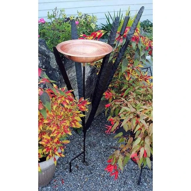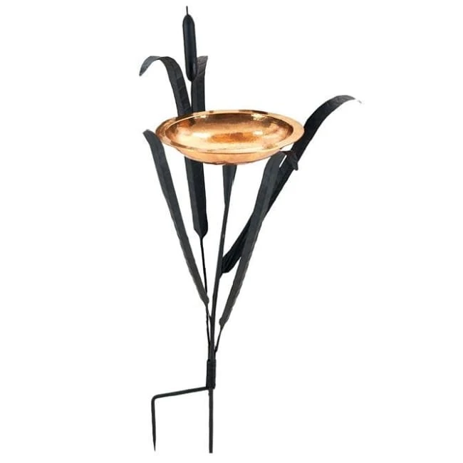 Turn your landscaping into a faux wetland by placing this Achla Copper Single Cattail Bird Bath within your flowers. The lasting, metal body, bold color scheme, and familiar shape of this item add a dynamic look to your garden, and showcase your love of wetlands and the natural world. Wrought iron rods create the leaf and cattail shapes, perfectly surrounding the included, 12.5″ diameter, polished copper bath. This basin affixes to one of the stalks on the stand in moments, and its fantastic rim provides perching and preening spots for your feathered friends. A hammered finish throughout the bowl creates a textured base, keeping it safe for birds, and the 2.25″ depth allows small and large birds to use it easily. The intricate stand not only frames the basin perfectly; its stalks are adjustable for a truly versatile and custom display. Keep them grouped together for a narrow presentation near the bath, or spread them outward for a more dramatic look. Detailing on this iron stand furthers the exciting realism on the item, and the black, powder coated finish protects it from the elements. Insert the 5.75″ long, step-in base into your soil for a stable accent. Bring your love of wetlands to your bird garden with this Copper Single Cattail Bird Bath. Assembly required.Â