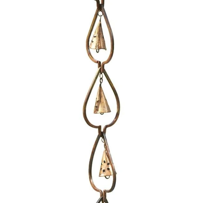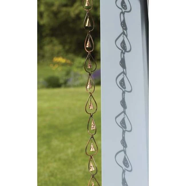 Celebrate elements of nature in a fantastic new way using the Ancient Graffiti Aspen Leaf and Bell Rain Chain. This unique method of directing water off your roof originated centuries ago in Japan, and this hardy piece will surely add both style and gentle sound to your home. Durable, square steel bars in aspen leaf shapes create the body of this chain, and a steel bell sits inside each leaf figure. As rain runs down the chain, it will slightly move and cause the bells to softly ring, for a gentle, soothing ambience. The aged copper colored finish blends with homes and gardens easily, and an included gutter clip makes installation simple. Each 4″ long leaf shape may be removed to fit your home just right, and the steel construction will certainly last for several seasons. Place a rain barrel or other receptacle beneath the chain to save the rainwater for use in your garden. Add wonderful sound and lovely shape to the corner of your home with this Aspen Leaf and Bell Rain Chain.