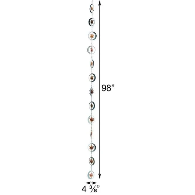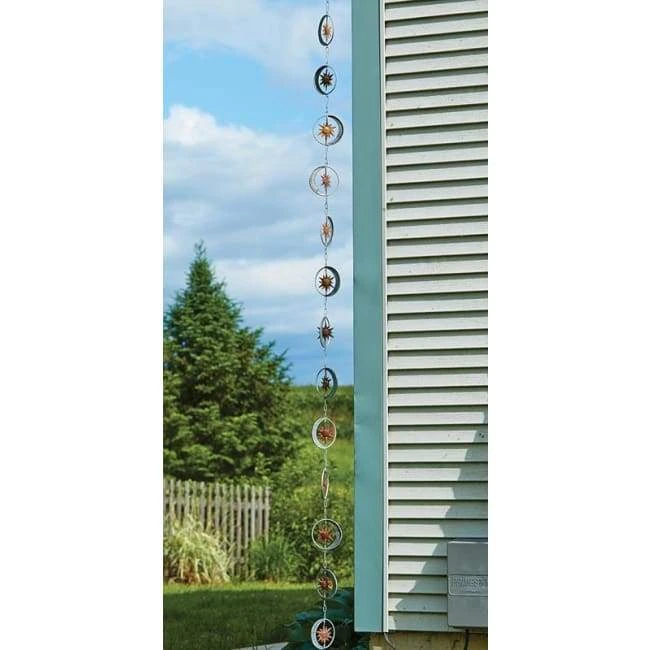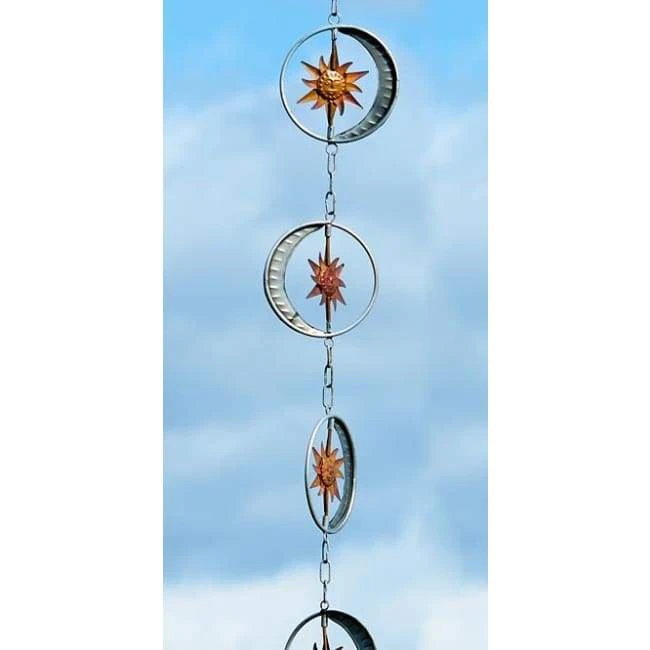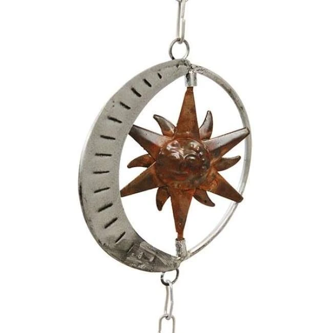 Bring a heavenly look to the corner of your home with this Ancient Graffiti Sun and Moon Rain Chain. The familiar motif and color scheme on this detailed piece are sure to capture attention, while providing a necessary function. Rain chains can easily take the place of a traditional downspout, directing rainwater from your gutter to the ground or a receptacle. Each of the 4.375″ diameter, steel circles holds a sun face with a wealth of rays, as well as a crescent moon along one side. The flamed copper colored finish of the sun contrasts the silver tone of the moon and loop, adding a brilliant bit of style to your home. Sections of chain connect each adornment together creating a generous, 98″ long piece, and these links can be opened and removed for custom sizing. The included gutter clip makes installation simple, and the sun accents spin in wind and rain for plenty of drama. Add a celestial hint to your home using this Sun and Moon Rain Chain.