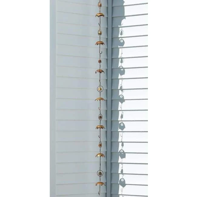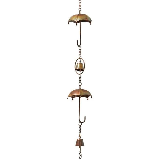 Celebrate rain in two fun ways using this Ancient Graffiti Umbrella and Bell Rain Chain. Hanging a rain chain from your gutter, rather than a downspout, brings style and personality to your home, and this unit will certainly lend whimsy and wonderful sound to your garden. Familiar, steel umbrella shapes create the lengthy body of this chain, bringing the rain theme to the forefront. A small bell inside a metal loop sits between each umbrella, and chain links connect each piece together for a cohesive unit. These bells ring gently as water moves down the chain, and the umbrella shapes direct the rain to the ground with ease. An included gutter clip makes it simple to install this item in place of a downspout, and the steel construction forms a lasting adornment. Place a rain barrel or other receptacle at the base of this chain to capture the rainwater, and use it to keep plants hydrated. The chain extends 93″ in length, and some links are removable to shorten the unit if needed. Showcase rain in a different and exciting way by placing this Umbrella and Bell Rain Chain on your home.