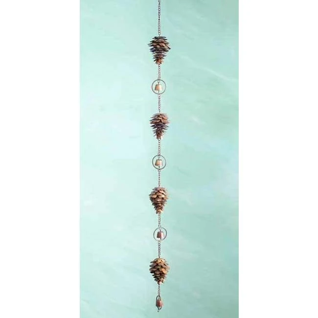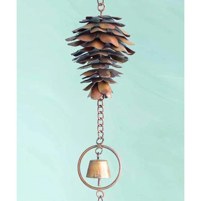 Showcase evergreens in your yard or home easily using this Ancient Graffiti Flamed Copper Colored Pine Cone Decorative Hanging Chain. This fantastic line of four, metal pine cone shapes lends natural style to your setting, while a bell between each cone provides gentle sound. The tapered shape and multitude of layers on each pine cone add realism to them, and a chain between these and each bell creates a connected piece of artwork. A 2.25″ diameter, metal ring around each bell brings further shape and style to this piece, while its brown tones enhance the natural look. Use the included hook to hang this adornment from a bracket or branch, to create wonderful sound in your garden or home. The metal construction remains durable for many seasons, and the classic color scheme celebrates the outdoors. Add a hint of evergreens to your home or yard with this Flamed Copper Colored Pine Cone Decorative Hanging Chain.