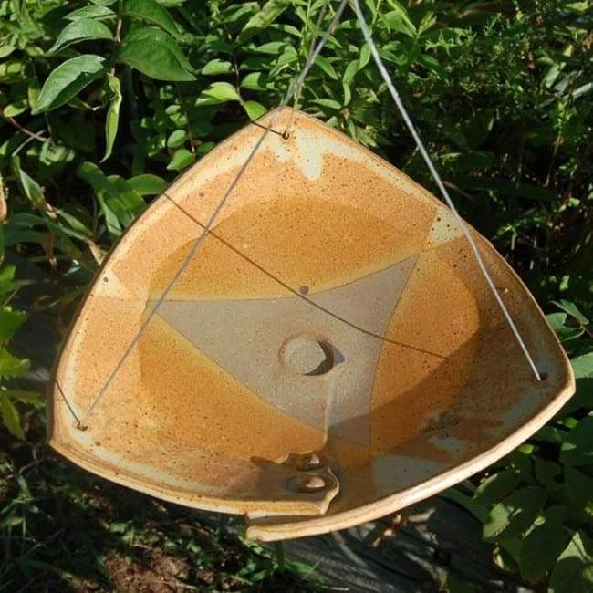 Blend modern shape with classic materials in your bird garden with this Anthony Stoneware Small Butternut Ceramic Bird Bath. The defined angles of this ceramic piece lend a striking look to your bird sanctuary, while the light orange and beige tones capture attention. The unglazed center of this 1.75″ deep basin allows birds to grip the bath as they preen, and the generous edge provides a bevy of perching areas. A durable, attached metal cable makes it simple to hang this bath from a branch or bracket, while its flattened base section rests on a level surface. Each piece is hand crafted on a potter’s wheel, and fired to 2400° Fahrenheit for a weather resistant and beautiful item. This also allows each unit to retain a bit of the artisanship of its creator, while the speckled orange finish enhances the natural look. Provide birds a lovely and lasting bathing area with this Small Butternut Ceramic Bird Bath. Made in the USA.