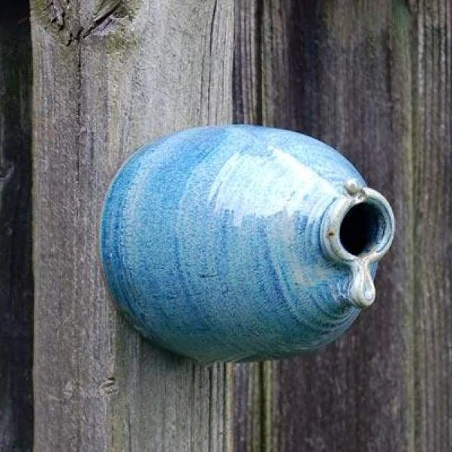 Add this Anthony Stoneware French Blue Peek-A-Boo Ceramic Bird House to your bird garden for an in-depth look at avian nesting activity. This charming and durable shelter is perfect for small songbirds, and its rounded shape adds an exciting look to the garden. The 5″ diameter, flat back of this home affixes to a fence, wall, post, or tree with its included screw and keyhole slot. The unit tapers toward the front, and a 1.25″ diameter entrance hole here enables chickadees or wrens to use the shelter. Its light blue glaze meshes with your landscaping, while its textured finish enhances the handmade appeal. Each home is fired to 2400° Fahrenheit to ensure durability and resistance to ultraviolet light, for a piece you and your birds can enjoy for many seasons. Watch bird nesting behavior in your backyard with this French Blue Ceramic Peek-A-Boo Bird House. Made in the USA.