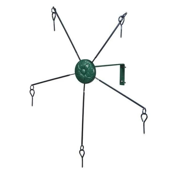 Watch squirrels dine and play simultaneously in your garden from this Heritage Farms Medallion Squirrel-Go-Round. Providing these animals their own feeding station can discourage them from overtaking your bird feeder, and this unit brings a fun element to the yard as well. A metal medallion with raised leaf detailing forms the feeder hub, and five metal arms extend outward from it. Each of these arms culminates in a threaded screw, perfect for holding an ear of corn or squirrel log. Attach this assembly to the included, metal bracket, which affixes to a tree trunk or wall in moments. As a squirrel grabs for the treat, its weight spins the center medallion, lending a surprising element to the feeder. The metal body remains durable for several seasons, and the green and black colors offer a traditional look. Divert squirrels’ attention to their own feeding spot by adding this Medallion Squirrel-Go-Round to your yard.
