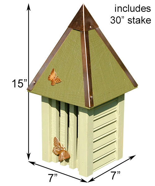 Provide beautiful butterflies a cozy and colorful home with the Heartwood Celery Flutterbye House and Pole. Architectural detailing throughout this shelter makes it a striking addition to your landscaping, while its fantastic green tones enhance your foliage. A light green, square body creates a roomy home, with beaded edge drop siding mimicking seaside cottages. A hipped roof tops this shelter, its deep green color bringing attention to your garden in moments, while a copper roof cap and trim on each edge complete the piece. Three vertical entry slots on the front of the unit mimic crevices butterflies often use for protection from the elements, and also contrast the horizontal beaded edge for a bit of style. Two copper butterfly appliqués on the item help draw the attention of these lovely insects, and the included, 30″ tall stake allows you to place this piece at just the right display height in your garden. Crafted from durable cypress, the home will look fantastic in your backyard for several seasons, and a copper cleanout panel on the back makes seasonal maintenance simple. Enjoy butterflies visiting your garden and provide them shelter in this Celery Flutterbye House and Pole. Made in the USA.