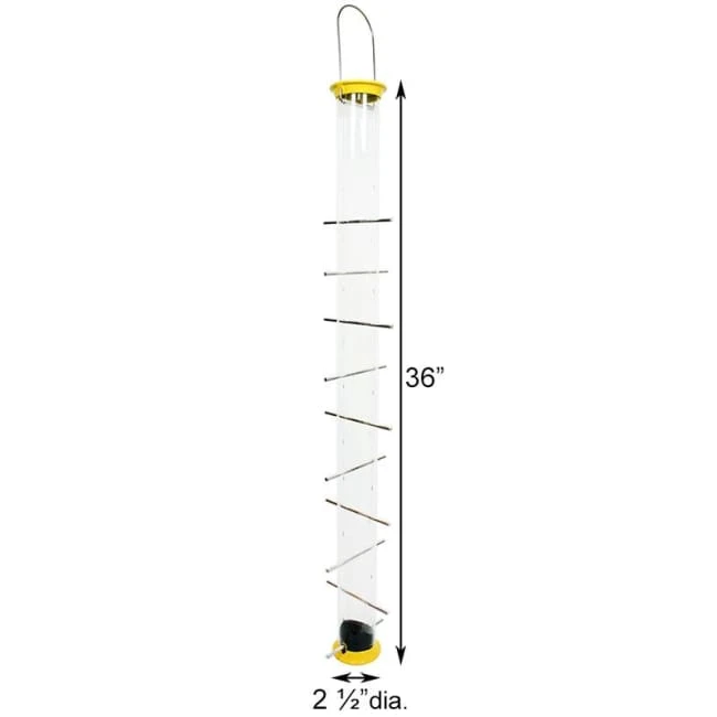 The Droll Yankees New Generation Finch Flocker Bird Feeder features an excellent design that will make a wonderful addition to any backyard sanctuary. Birds may rest comfortably at any of the twenty individual perches at the thistle seed ports. The clear, UV stabilized polycarbonate feeder tube keeps the seed level visible at all times and is perfect for holding 2.5 quarts of seed. An internal seed baffle design directs seed to the ports so that the feeder empties completely without leaving a dirty residue. Simply slide the die-cast metal cap up the hanger for quick, convenient cleaning and filling. With its durable construction, the Droll Yankees New Generation Finch Flocker will serve the birds in your wildlife habitat faithfully, season after season. This feeder may be hung on the included metal loop hanger or pole mounted using any pole with a 3/4″ threaded adapter (not included). Made in the USA. Lifetime Guarantee.