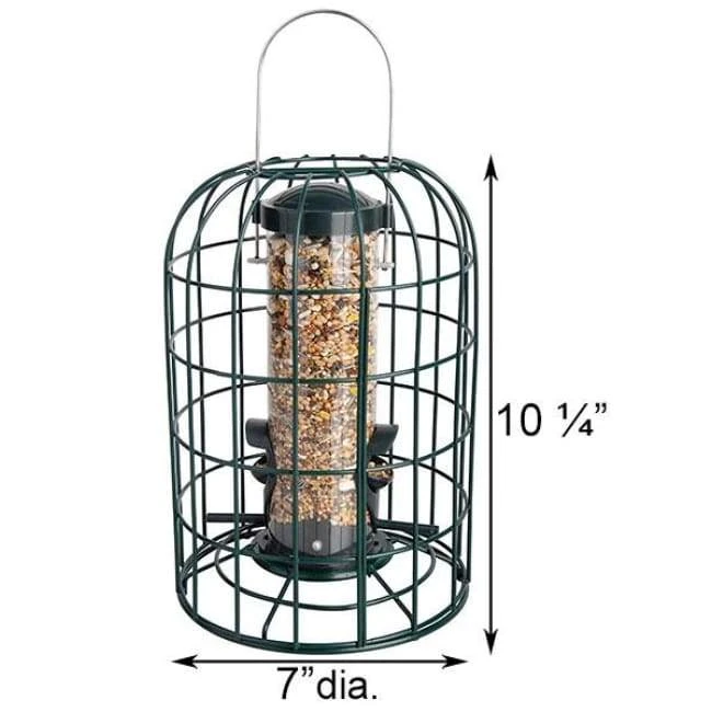 Create a feeding area just for small birds using the Esschert Design Caged Tube Bird Feeder. Covering a traditional feeder with a wire cage helps protect it from large birds, so smaller birds can dine undisturbed. The center, 2.625″ diameter tube holds 0.5 quarts of sunflower seed, safflower seed, or cracked corn, accessible via the two bottom ports. Twist the port openings 180° to feed thistle instead, offering a treat to different birds. A green metal cage surrounds this seed tube, and its 2″ long and 1.375″ wide openings allow only small birds to reach the unit. Place this feeder on a hook or bracket with the included metal hanger, for both you and your birds to enjoy it. When not suspended, the cage lifts easily from the feeder for thorough cleaning. The cap may also be lifted at this time to refill the piece, and the green color blends with your garden. Its plastic tube, ports and lid create a family-friendly unit, while the metal grid and hanger add durability. Keep your small songbirds fed with this Caged Tube Bird Feeder.