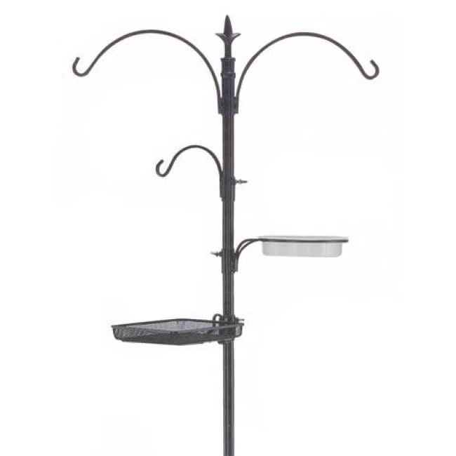 Create a birding haven in minutes with the Gardman Wild Bird Feeding Station Kit. This package includes hooks and hangers for all your bird feeding needs. The top of the kit has two 10″ shepherd hooks, which hold items up to 20″ in diameter. Use these hooks to hang two feeders, or hang a flower basket on one hook and a feeder on the other for a more natural look. This flower/feeder combination will entice different types of birds to visit your yard. A 5″ feeder hook connects onto the main shaft to hold a smaller item, such as a suet feeder. An included 7″ long by 7″ wide micro mesh feeder tray also attaches to the pole and holds half a quart of mixed seed, fruit, or mealworms for even more feeding variety. Offer your birds fresh water along with this buffet of seed and feed in the included 5.75″ diameter plastic bird bath. The bath attaches to the station with a metal support ring. The 1.25″ depth of this bath offers the perfect amount of water for smaller songbirds to bathe or drink. The steel construction of the unit will withstand exposure to the elements, and the black color blends with any environment. A fleur de lis finial tops the pole for a decorative accent. Use the pointed end of the pole to anchor the unit at least 12″ into the ground. Feed a myriad of birds in your yard from the Wild Bird Feeding Station Kit. Assembly required.