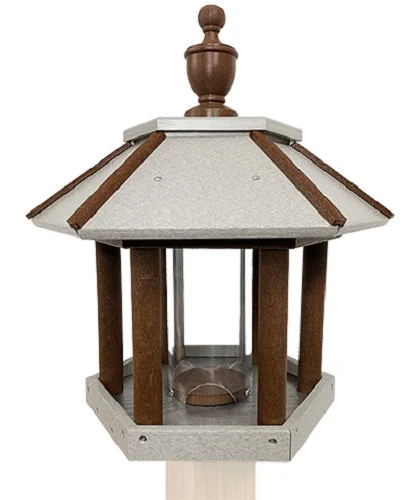 Create a luxurious dining spot for your feathered friends when you add this Gray and Brown Polywood Recycled Plastic Gazebo Bird Feeder to your yard. Rounded, dark brown pillars, rafters, and top finial replicate wood, contrasting the gray roof, frame, and lid. The vigorous, recycled plastic lumber construction brings durability to the piece, while reducing landfill mass. A central, clear plastic tube readily holds 1.4 quarts of mixed seed or cracked corn, and a polywood disc at its bottom diverts feed to the 3 arches, ensuring the reservoir empties completely. This column sits on a generously perforated, metal base, increasing dining area and providing plenty of drainage. The hexagonal roof fully protects the feed from precipitation, and a brown finial adds height. Lift the top section of the roof upward for refilling or cleaning the item in moments. Dual, polywood slats on the underside of the feeder each have predrilled holes, for attaching this adornment to a wooden 4 x 4 post easily. Its hexagonal frame forms a familiar gazebo shape, providing birds a sophisticated station, and the neutral gray and brown hues softly enhance any setting. Post this Gray and Brown Polywood Recycled Plastic Gazebo Bird Feeder in your yard for a lively and lovely avian dining spot for years to come. Made in the USA.