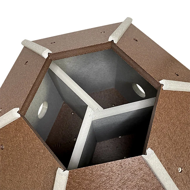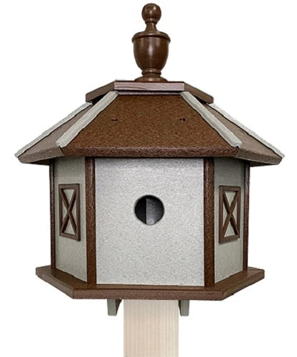 Welcome your feathered friends into a sturdy barn-style abode with this Brown and Gray Polywood Recycled Plastic Gazebo Bird House. This dwelling made entirely from recycled plastic offers a conscientious yet brawny choice for an avian home. The neutral tones of the house appear both timeless and modern while also not so easily revealing dirt and debris. Its gray sides further complement its fellow earth-tone brown roof, base, and matching trim outlining square faux windows. The hexagonal structure of the home provides 3 diamond-shaped chambers, each with a 1.5” diameter hole for small birds to enter. The house’s removable finial top fits firmly into its hexagonal overhanging roof, allowing access into the interior while itself providing enough of an overhang to prevent moisture penetration. The structure’s base mounts easily to a 4 x 4 post owing to 4 pre-drilled holes in each of two rails. The window trim provides aesthetic appeal while all other sides and parts are made of uniformly 0.5” thick polywood pieces protecting from the elements the three 180 square inch compartments. Exhibit an appreciation for the barn lifestyle within or above your habitat with this Brown and Gray Polywood Recycled Plastic Gazebo Bird House. Made in the USA.