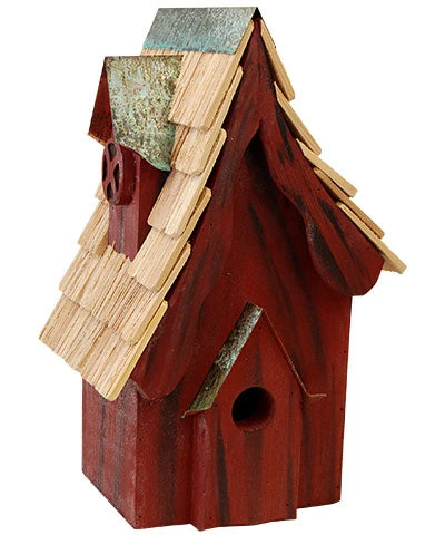 Add the charm of a country cabin to your bird garden with the Heartwood Redwood Boyds’ Bungalow Bird House. The shingled roof, cypress body, and metal accents on this shelter bring a whimsical look to your backyard, and are sure to delight you and your feathered friends. The red color of the home enhances your nearby blooms, and mottling throughout it creates an aged effect. The pitched roof sports slightly uneven sides, a scalloped fascia, and cypress shingles for a unique look, while verdigris copper covers the top ridge. Additional, aged copper above the extended front panel and side dormer bring more texture and an artistic feel to this home, and a cleanout disc on the back completes the item. A 1.5″ diameter entry hole sits on the extended front panel, allowing birds to easily roost in this bungalow, and the all cypress construction ensures a hardy shelter. Long slots beneath the roof overhang keep the home nicely ventilated, while a drainage gap on the base helps any captured water escape. Use the included, metal mounting plate to secure this home to a 4 x 4 post (not included), so both you and your birds can enjoy it for many seasons. Bring fun shape and curves to your backyard using the Redwood Boyds’ Bungalow Bird House. Made in the USA.
