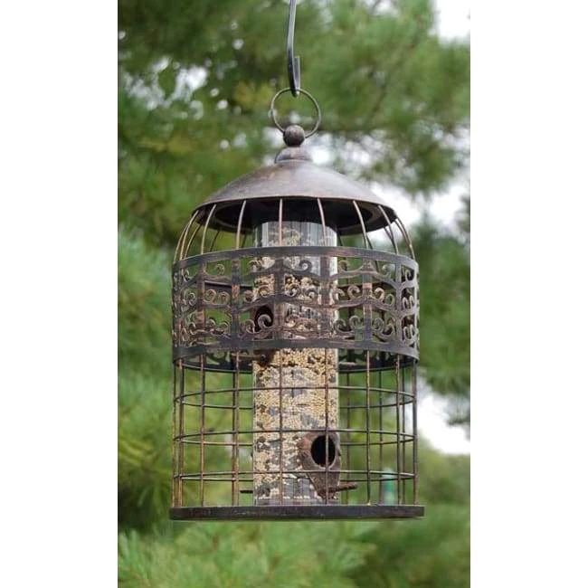 Provide your backyard birds a majestic feeding spot with the Heath Grand Palace Caged Bird Feeder. This ornate, caged unit allows you to feed your favorite small birds, while deterring squirrels and larger birds from dining. A band of metal curls surrounds the top section of the cage, and bronze tones throughout this area gleam in sunlight for a striking effect. The 1.375″ square openings on the grid offer passage to smaller birds, and a solid metal top and orb complete the unit. A 2.75″ diameter seed tube rests inside this metal frame, easily holding 0.8 quarts of cracked corn or safflower seed. The four, reinforced metal ports help birds reach their treat, and a perch on each port offers them a resting spot. A raised base on the seed tube forms a baffle, preventing a dirty residue, and a metal tray at the base provides extra dining spots. The item disassembles for thorough cleaning, and a top loop makes hanging the piece simple. Its plastic and metal construction is great for seasons of use, while the clear reservoir helps you monitor seed levels at a glance. Place a remarkable feeder in your garden with this Grand Palace Caged Bird Feeder.