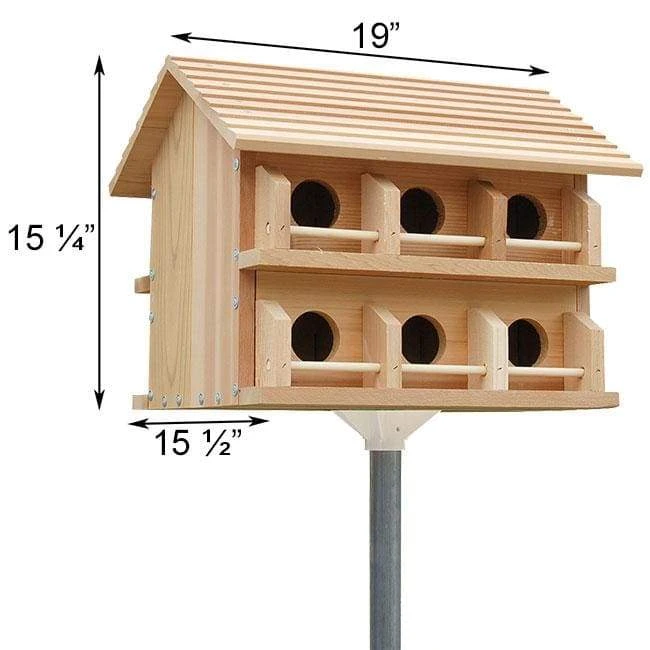 Install the Heath Cedar Purple Martin House in your lawn or garden to offer martins a beautiful place to colonize. Capable of housing up to twelve separate martin families, this house features cozy apartments 4″L x 5″W x 5.25″H. Ventilation holes ensure that each unit remains at a comfortable temperature. Porch dividers help prevent male domination issues, while perch railings offer a place to rest before entering the 2.125″ diameter openings. The pitched roof overhangs the porches, shedding water and protecting your bird tenants. Use the included mounting plate to fasten this durable home atop a Heath Martin House Pole (not included) in an open space of your lawn. Enjoy the beautiful presence of musical purple martins living in your Cedar Purple Martin House. Some assembly required.