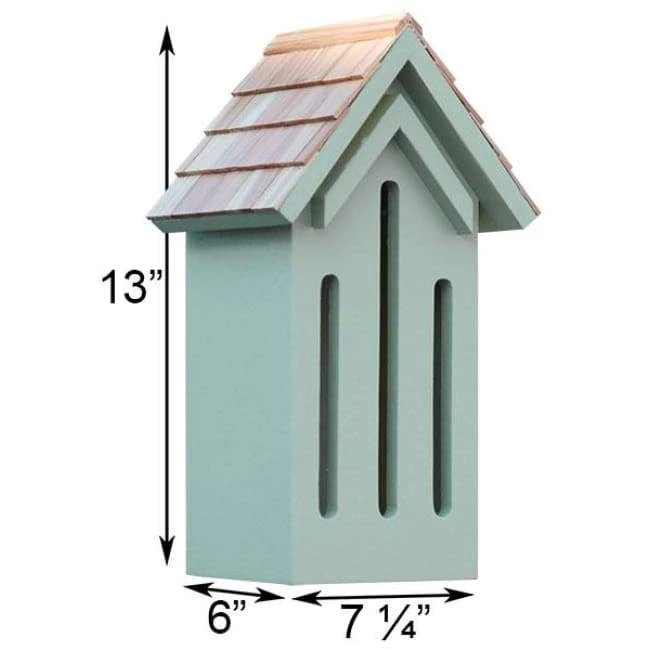 Offer beautiful butterflies shelter in your garden using the Prime Retreat Classic Green Butterfly House. Many of these captivating insects hibernate through the cold winter months, and also require a refuge during summer rainstorms. Providing this home creates a place for butterflies to hide from predators, stay dry, and rest. The front panel of this shelter has three elongated slots, mimicking crevices in wood piles or bark that butterflies often use for protection. A pitched roof covers the roost, with cedar shakes on it for added design. A hanging tab on the back of the unit enables it to be placed on a post or against a wall, while the flat base allows it to attach to a pole with a mounting bracket (not included). The back panel removes from the home, for you to place twigs and leaves in it for added shelter. The soft green color enhances your garden, and the wooden construction creates a safe haven. Invite butterflies into your yard with this Classic Green Butterfly House.Â