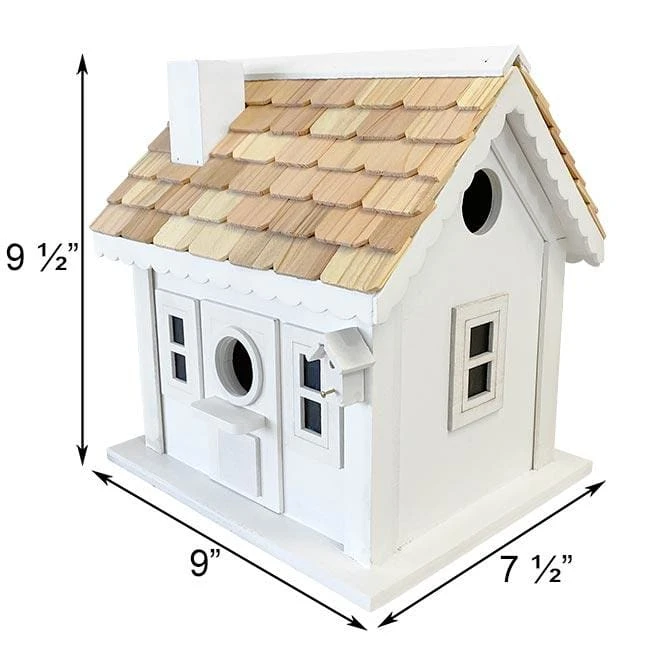 Offer birds an adorable resting spot by adding this Home Bazaar Charmer Condo Bird House to your yard. The vivid white color and amazing architectural detailing bring wonderful style and realism to your bird garden, while creating a working nest box. Tan hues throughout the pitched, shingled roof contrast the painted white body, and a flat base easily supports the unit. Black paint within the faux window shapes further the realistic look, completed by a scalloped roof edge and tiny wooden bird house. A front, 1.25″ diameter entry hole sits between the window shapes, and a small ledge below it provides extra landing area. Another 1.25″ diameter entry rests on one side of the shelter, and the roof overhangs each to protect the unpainted interior from the elements. Hidden holes on the back panel help ventilate the domicile, and the wooden body and white tone prevent nestlings from overheating. Additional holes on the base provide drainage, and one side panel fully removes for nest checks. Attach a mounting plate (not included) to the base of the home for displaying it on a post or pole easily. The wooden body and white color bring a striking look to your garden, lending a touch of manmade style to the setting. Welcome birds into your backyard with this Charmer Condo Bird House.