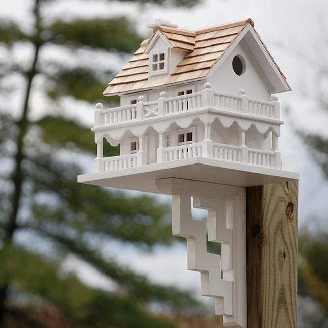 House your birds in style with the Home Bazaar Novelty Cottage Bird House. This home is modeled after quaint New England homes that will welcome any bird. Railed walkways on each story of the home and a dormer on the cedar shingled roof attest to the handcrafted beauty of this abode, and the 1.25″ openings on either side are perfect for small songbirds. The dwelling is divided in the middle, providing room for two bird families, and the flat back can be easily unscrewed for seasonal cleanouts. Four windows on the front of the house allow you to easily observe your bird tenants, as well as ventilate the nesting sites. Mount this home onto a post using the included mounting bracket. Put the Home Bazaar Novelty Cottage Bird House in your yard and offer a beautiful haven to your birds year after year.