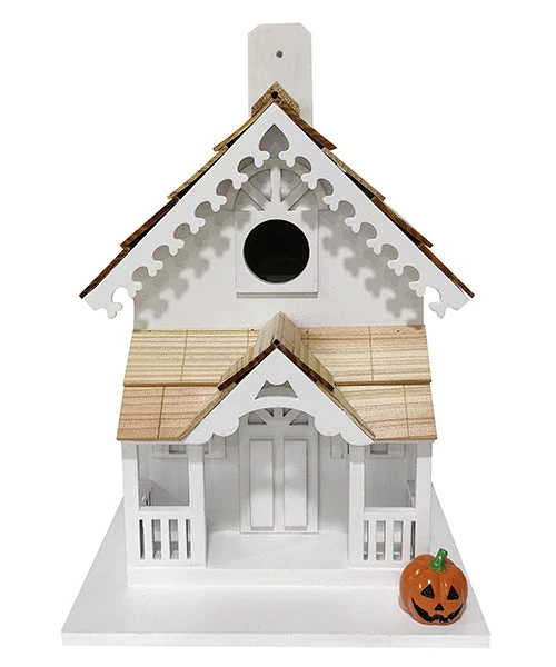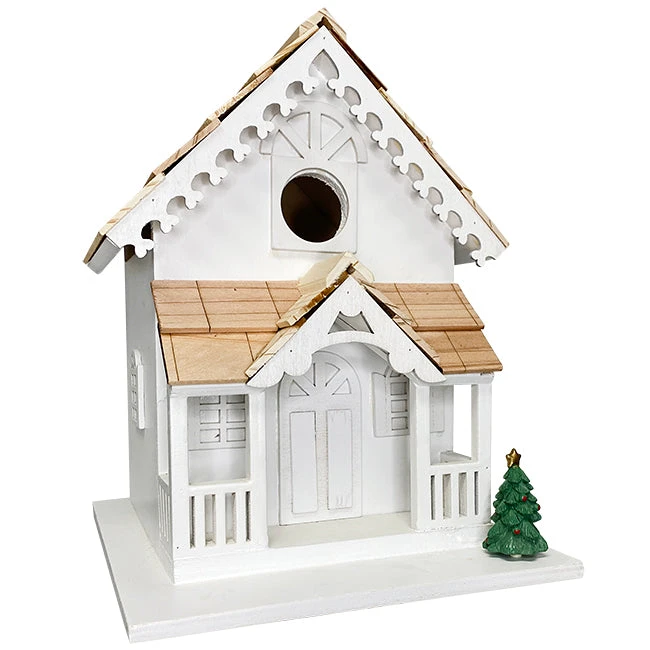 Integrate a bird house into your garden décor throughout the year with this Home Bazaar Season’s Tweetings Bird House. Not only will this detailed, all white shelter provide a convenient nesting site for small songbirds; its included, changeable accents enable you to keep it fresh and fun for each season. The extended front porch with overhanging roof and dormer perfectly create a welcoming effect for both songbirds and garden visitors, and intricate detailing throughout the roost captures attention. Trim on the top roof line enhances its steep pitch, and this overhang protects the 1.25″ diameter entry and interior nesting area from the elements. Additional gaps beneath this overhang ventilate the shelter, and a bottom hole provides drainage. Hardware cloth beneath the entry enables fledglings to climb upward and reach it when ready to fly, and a generous, rectangular platform supports the domicile. A small depression in the front corner of this platform accommodates the included wooden accents, turning this shelter into a garden focal point. A replica bird house and stylized American flag are great for the summer, while a football and jack-o-lantern figure can be placed here through the fall. Switch that for the Christmas tree in the winter to celebrate throughout the year, with its green color brightly contrasting the white home. A significant back panel removes for nest checks and maintenance, and a tab swings upward to place the piece against a wall or fence post with ease. Rest its flat base on a level surface indoors for a different display, or attach a mounting bracket (not included) to the base for pole or post mounting. Decorate for each season in moments using this Season’s Tweetings Bird House.