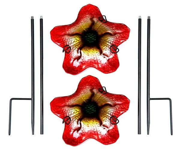 Transform the corners of your garden into appealing gathering spots for local birds by placing these Summer Burst Glass Bird Baths with Stakes in them. These two detailed, matching glass bowls are perfect accents to any bird sanctuary, and will add a touch of color to your landscaping. Five red and yellow petals and a brown and green center make up these glass flowers, accompanied by impressed lines throughout. This textured design provides birds plenty of gripping spots, and the 1.5″ depth is safe for small songbirds. The dark red tinge on the edge of the glass petals further captures attention, and three curved arms on the integrated metal cradles perfectly support these baths. A threaded port at the bottom of each cradle accommodates the included, metal stakes, and their 4” long, step-in bases provide lasting anchors when installed in soil. The two pieces of each shaft thread together for secure connections, and their black finish meshes with the cradles for elegance. Remove the bowl and cradle assembly from each post for thorough cleaning, and use one bowl as a feeder and the other as a bath for more variety and avian excitement in your yard. Flank your garden with ever blooming, colorful flowers using these Summer Burst Glass Bird Baths with Stakes. Some assembly required.