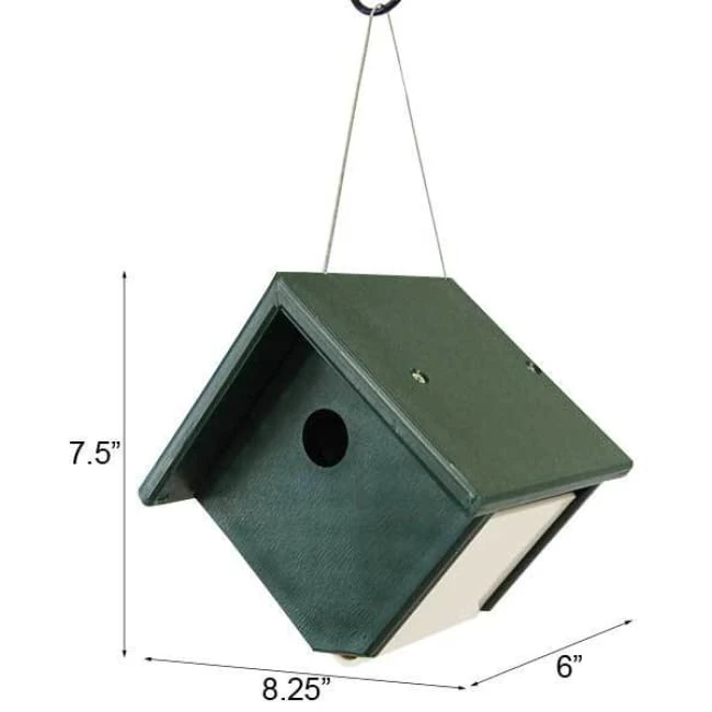 Add exciting shape and a comfortable bird roost to your garden with the Songbird Essentials Hunter Green and Ivory Wren House. The bold, diamond shape of this shelter brings interest to your yard, while the green and ivory color scheme adds a natural hint. A 1″ diameter entry hole occupies the front panel, allowing chickadees and wrens to access the unit easily. Its pitched roof directs water away from the entry, and ventilation slots keep the recycled plastic home both comfortable and safe for nestlings. A textured surface on the inside of the front panel helps fledglings exit the home when ready. Check the nest or clean the home regularly by unlatching one side of the roof, and use the attached cord to hang it from a bracket. The recycled plastic lumber not only forms a durable roost, it also helps keep plastic out of landfills and reduces deforestation. Provide a fun and lasting home to wrens with this Hunter Green and Ivory Wren House. Lifetime guarantee.