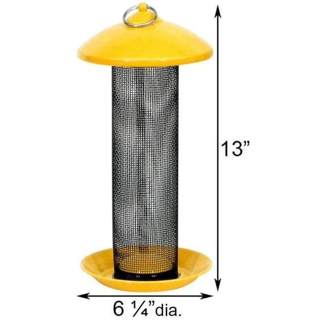 Invite finches to dine in your garden by placing this Stokes Yellow Finch Screen Mesh Bird Feeder in it. Designed to withstand the elements, this robust feeder offers select backyard birds a splendid thistle snack. The 2.75″ diameter seed tube holds up to 1 quart of thistle seed, and its 1/16″ wire mesh allows birds to cling and dine. A bold yellow, 6.25″ diameter metal roof not only protects the seed from precipitation; it also adds color and style to your yard. A matching, 6.25″ diameter seed tray completes the unit, and a raised center section acts as a seed diverter, ensuring the tube fully empties. Drainage holes surround the baffle and help keep the thistle seed dry, and the top and base twist and lock for quick disassembly and thorough cleaning. A top metal ring allows you to hang this feeder from a hook or branch, and the mesh reservoir keeps seed levels visible at a glance. Create a wonderful and vivid bird feeding spot in your backyard with this Yellow Finch Screen Mesh Bird Feeder.
