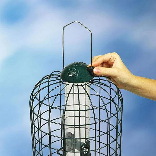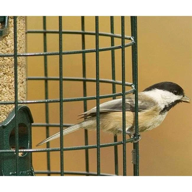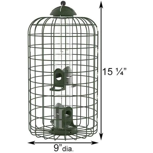Provide your backyard birds with a squirrel-free feeding sanctuary using the Stokes Squirrel Resistant Bird Feeder. Adding a caged feeder to your bird garden places a physical barrier between seed and squirrels, discouraging them from dining. This lasting, metal cage surrounds the clear plastic seed tube, which is perfect for offering birds 1.25 quarts of sunflower seed or a seed blend. Four reinforced feeding stations, each with ergonomic perches for avian comfort, allow a few birds to dine at once. A die cast, metal lid keeps the seed protected from rain, and an innovative locking system here prevents squirrels from lifting the cap and stealing seed. The deep green, 1.5″ square mesh around this tube adds an extra squirrel deterrent, stopping them and larger birds from reaching the feed, while ensuring the reservoir remains easily visible. An internal baffle at the base of the seed tube directs it to each port, so the unit empties completely, and the deep green finish on the cage and cap enhance your backyard. These wonderful features ensure a durable and thoughtful feeder, perfect for keeping squirrels at bay. A port on the base accepts a 1″ outer diameter pole, to pole mount the unit, and the attached metal loop allows you to hang the item easily. The lid lifts up this attached hanger for refilling or cleaning, for a feeder you will enjoy year after year. Stop squirrels from dining using this Squirrel-Proof Bird Feeder.