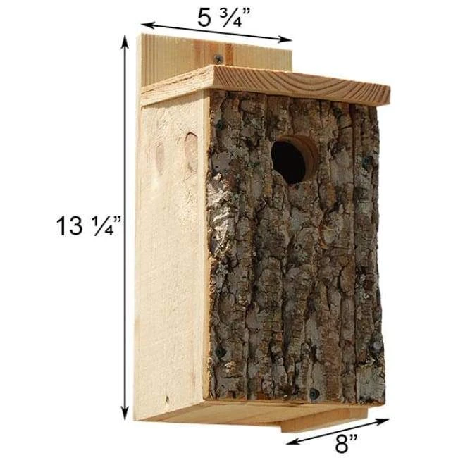 Create a beautiful, tree-like home for bluebirds in your yard with this Uncle Dunkel’s Bark Clad Bluebird House. The classic shape and wooden frame form a durable home, while the bark overlay on the front panel adds fantastic, natural style to the piece. Bluebirds enter the shelter through the 1.5″ diameter opening on this front panel, and the poplar bark here provides texture. The sloping roof overhangs the entry hole, protecting the nest from rain, while gaps at the corners of the base allow water to drain. Slots at the top of the home help it remain ventilated, and one side panel lifts upward for nest checks. A predrilled hole at the top of the extended, back panel allows you to place this home against a wall or post, and its level base may be attached to a mounting plate for placement on a pole. The 0.5″ thick, wooden body keeps the unit insulated and durable, for use for many seasons. Add a nature-inspired roosting spot to your bird garden with this Bark Clad Bluebird House. Made in the USA.