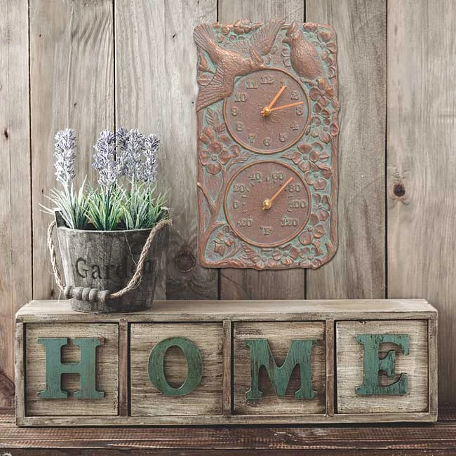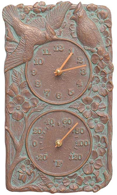 Add avian antics to your outdoor wall using the Whitehall Cardinal Clock and Thermometer. Three-dimensional cardinal, flower, and branch shapes form the detailed frame on this piece, lending a natural look to your patio or deck. One of the cardinals appears in flight, while the other seems to rest within the branches. Two circles occupy the center of this rectangular unit, the top one an analog clock and the bottom one creating a thermometer. The clock runs on a single, AA battery (included), and the -20° to 120° Fahrenheit temperature range allows the thermometer to measure both cold winters and hot summers. Crafted from durable aluminum, the item will easily withstand use outdoors for a fantastic garden addition. Its copper background color enhances the nature scene on it, while verdigris hues within many of the depressions and crevices add contrast. Attach this unit to your wall with its included mounting hook, so you can obtain both the time and temperature at a glance. Enjoy cardinals in your living space while monitoring the weather and time with this Cardinal Clock and Thermometer. Made in the USA.