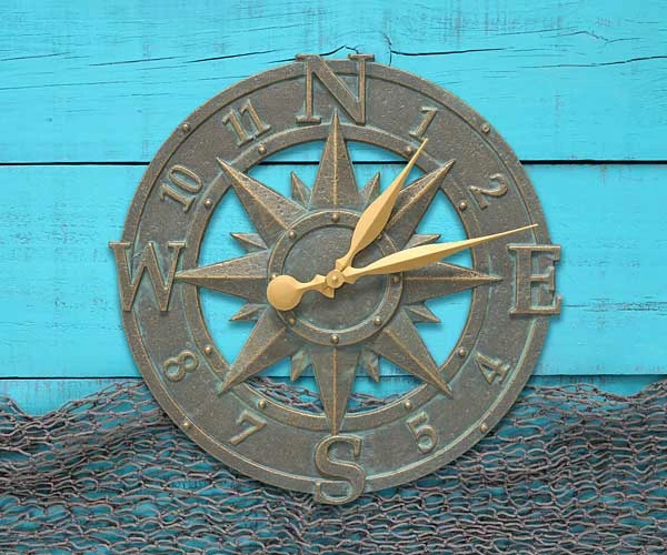 Keep your day on course using this Whitehall Bronze Verdigris Compass Rose Clock. The brilliant shape, green and bronze hues, and aluminum construction make this piece a wonderful addition to your home or patio, while lending a nautical hint to the setting. A 3″ wide ring holds numerals, forming a clock, while directional indicators replace the hours of 3, 6, 9, and 12 for a fun compass effect. A classic, compass rose cut out forms the center of the piece, furthering the motif, and gold colored hands extend from the center of this section for a working clock. The included AA battery keeps the mechanism running well, while the raised numerals and directionals ensure dimension and visibility. Place this clock against an indoor or outdoor wall using its included hanger, and enjoy the shine from the unit’s varied green and bronze tones. Its all aluminum construction is perfectly suited for use around your pool or in your living room, remaining lovely for seasons of service. Successfully navigate your day with help from this Bronze Verdigris Compass Rose Clock. Made in the USA.