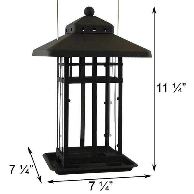 Continue the architectural theme of your home into your bird garden using this Audubon Mission Style Bird Feeder. The classic, rectangular shape and recognizable, top gridwork bring a striking look to this unit, completed by its black color. A pyramidal, metal roof with cupola creates height, and fantastically protects seed from the elements. Four plexiglass panels form the seed reservoir, holding 1.7 quarts of cracked corn or sunflower kernels with ease. A square base matches the top, and creates dining spots for a few birds. Drainage holes on this section help feed remain dry and fresh, and a gap at the bottom of each panel enables birds to reach the food. A raised section of the base diverts seed to each port, preventing build up, and the clear panels make monitoring avian activity simple. The generous, metal wire allows the unit to hang from a bracket, and the lid slides up this hanger for easy refilling. Crafted from metal and plastic, the feeder will look great and serve your backyard birds for many seasons. Bring classic shape and design to your garden using this Mission Style Bird Feeder.
