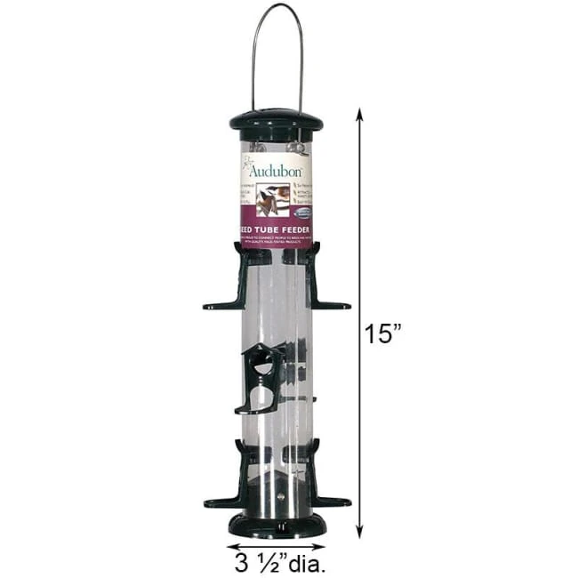 Help your child become interested in birding with the Audubon Seed Tube Bird Feeder. This functional and colorful unit is a perfect feeder for beginning and advanced birders. A durable polycarbonate plastic tube keeps seed levels visible at all times, and the six feeding ports offer room for a few different birds to dine simultaneously. Green plastic surrounds each port, and a perch creates places for birds to sit. The tall tube holds 0.7 quarts of mixed seed, perfect for offering fresh food to your feathered friends. An attached metal hanger at the top of the feeder enables it to be hung in a tree or on a hook. The base has an integrated baffle, to prevent seed from gathering and spoiling. Additionally, drainage holes allow air to enter the feeder and water to drain out for even fresher seed. With its sturdy plastic construction, the Seed Tube Bird Feeder is sure keep your avian friends devoted to your garden season after season.