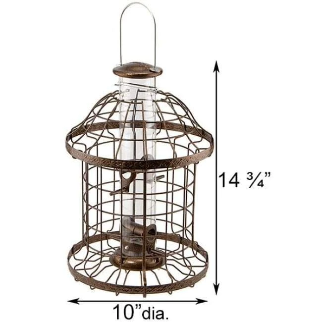 Add elegant shape and tones to your bird garden while deterring squirrels from dining with the Woodlink Caged Wild Bird Feeder. Using a cage around a tube feeder often keeps squirrels and large birds from reaching seed, and this piece adds a touch of timeless style to its function. A 2.5″ diameter seed tube rests in the center of the metal cage, capable of holding up to 0.8 quarts of cracked corn or safflower seed. Four reinforced metal ports allow small birds to reach the seed, and the clear tube keeps feed levels visible at a glance. A metal base in the tube has four drainage holes to keep seed from spoiling, and its raised design ensures the tube empties fully. The mottled brown finish on the base and cap blend with the generous cage, and its 1.5″ square openings stop large birds from reaching the snack. Horizontal bands at the top and base of the enclosure lend structure to it, supporting the inward and outward flares for a bit of drama. The open squares on the base allow seed to drop to the ground, stopping squirrels from clinging onto the metal frame and dining. Metal discs on the hanger acts as locks, keeping squirrels from lifting the lid to reach seed, and the sturdy hanger here makes placement simple. Lift the locks and lid to clean or refill the seed tube in moments. Offer small songbirds a lovely feeding haven with this Caged Wild Bird Feeder.ย