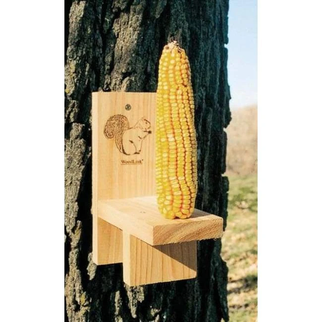 Give squirrels a comfortable place to dine with the Woodlink Squirrel Chair Ear Corn Feeder. The shape of this charming feeder evokes a tall backed chair, with intersecting vertical and horizontal pieces of cedar forming the frame. An additional wood piece rests under the horizontal section, creating an extra chair leg and helping the unit remain stable on a flat surface. A sturdy screw at the end of this feeder faces upward, and easily holds an ear of corn for the delight of your squirrels. A laser etched image of a squirrel in a dining position rests on the back of the feeder, for added interest. Use the two predrilled holes to mount this item to a post or tree, and ensure it is level for squirrels to rest on it easily. Direct squirrels away from your bird feeder to their own food source using this Squirrel Chair Ear Corn Feeder. Made in the USA.